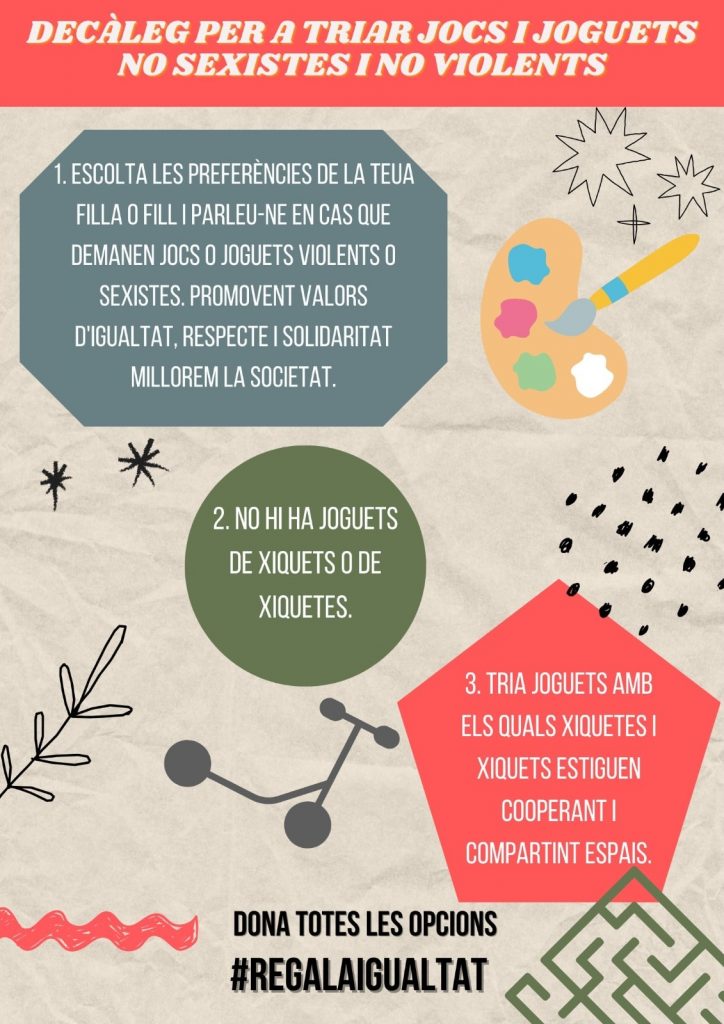 Per ajudar als Reis Mags de l’Orient, vos fem arribar el decàleg per a triar jocs i joguets no sexistes i no violents, per tal de fomentar en les nostres criatures valors d’igualtat, respecte i solidaritat.